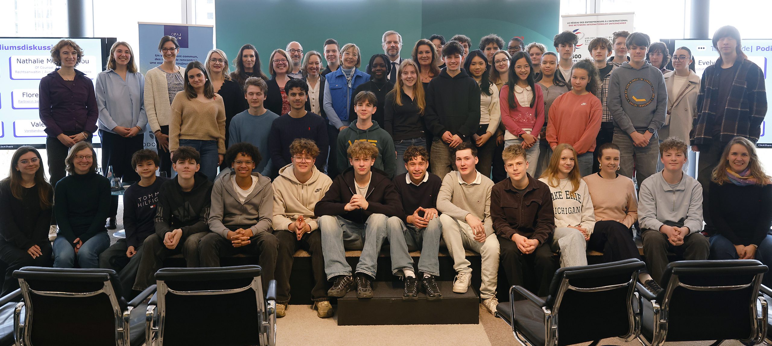 Deshalb haben wir anlässlich 20 Jahren Entdeckungstage des DFJW/OFAJ rund 45 Schülerinnen und Schüler der Otto‑Hahn‑Schule (Frankfurt) und der Julius‑Liebig‑Schule (Darmstadt) zu einem besonderen Projekttag in der ODDO BHF Gruppe empfangen.